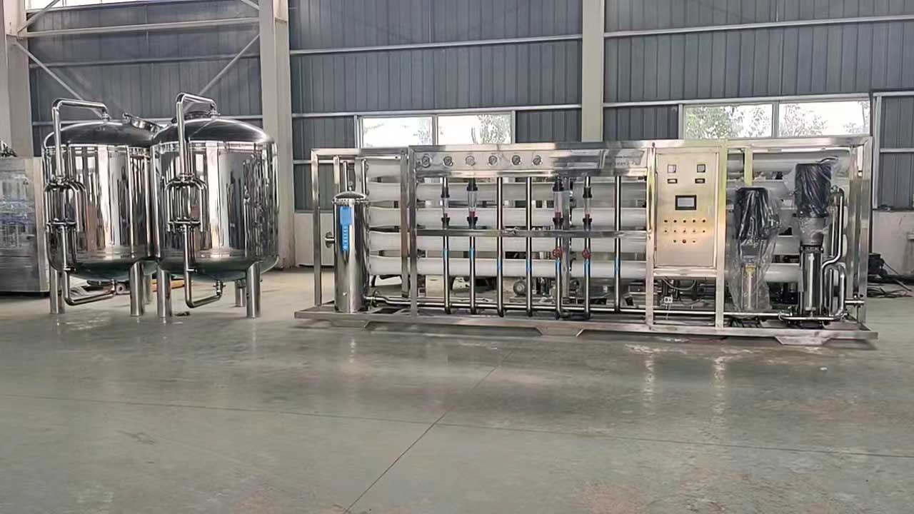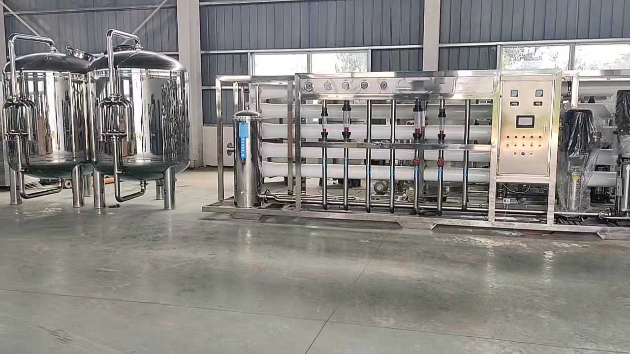 1、工艺流程:原水→原水箱→原水泵→石英砂过滤器→活性碳过滤器→加药箱→保安滤器→一级高压泵→一级反渗透→加药箱→二级高压泵→二级反渗透→纯水箱→紫外线杀菌→输送泵→保安过滤器